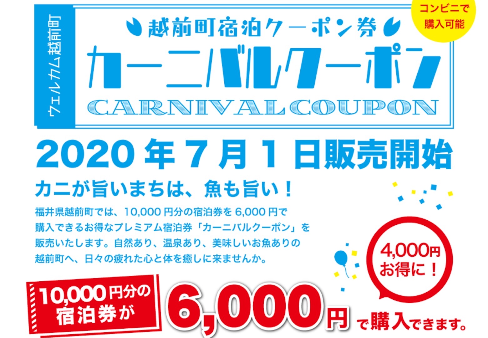 全国のコンビニエンスストアで、越前町の対象施設で利用可能な10,000円分の宿泊券を6,000円で購入することができます。また、一人当たりの購入枚数の制限はありません。2020年の10月31日まで利用が可能です。
